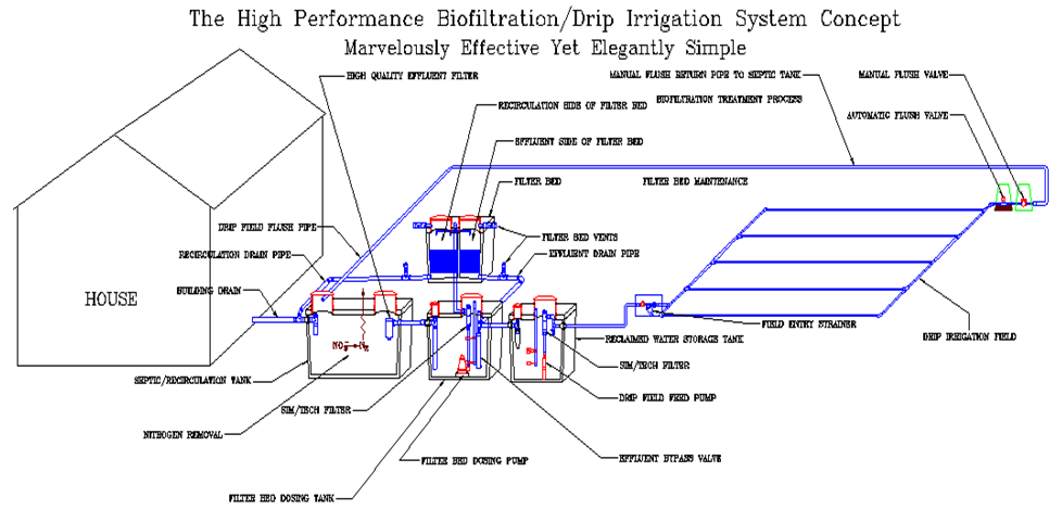 The reuse can be done house by house if the development features larger lots, with wastewater service provided by on-site wastewater systems, commonly called “septic” systems. Those on-site systems can employ the highly stable and reliable High Performance Biofiltration Concept system mated with a subsurface drip irrigation dispersal system. This concept is illustrated in Figure 14.