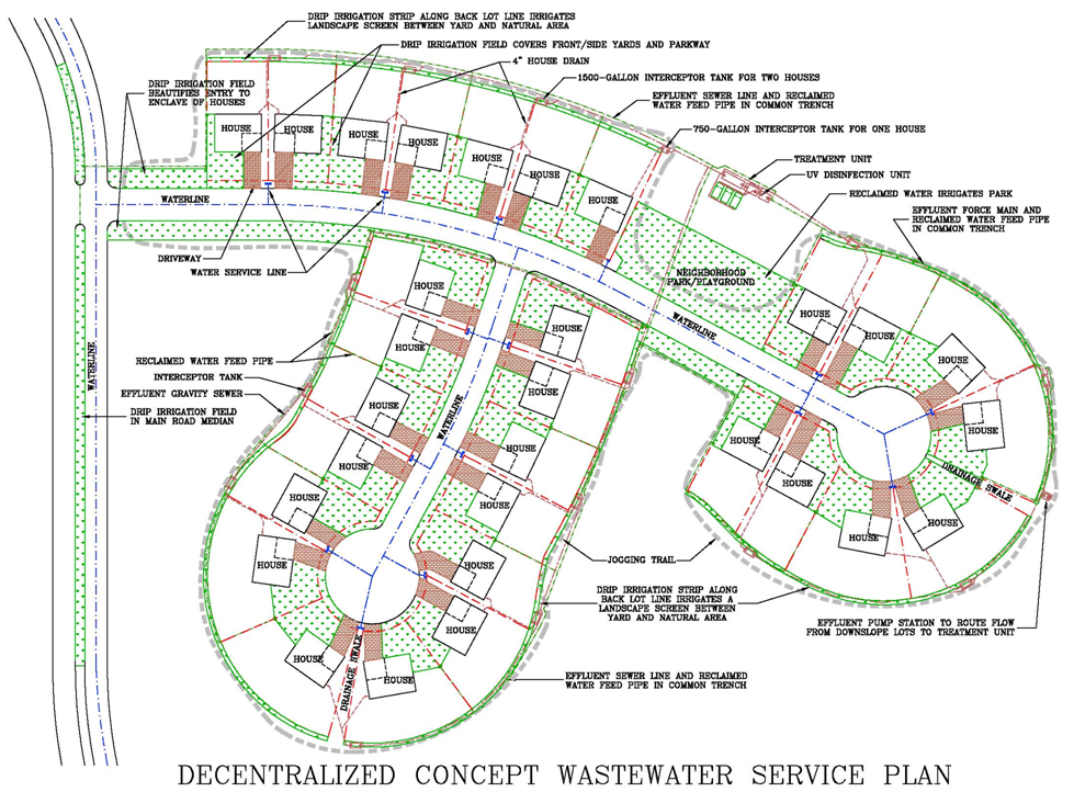 As can be seen in Figure 16, this strategy is about water management, not about “disposal” of a “waste”. Reuse is designed into the very fabric of the development, as if it were a central function, rather than just appended on (maybe) to the system at the end of the pipe, as if it were just an afterthought. And by distributing the system like this, all the large-scale infrastructure outside the neighborhood – the large interceptors and lift stations – would be eliminated, imparting considerable savings.