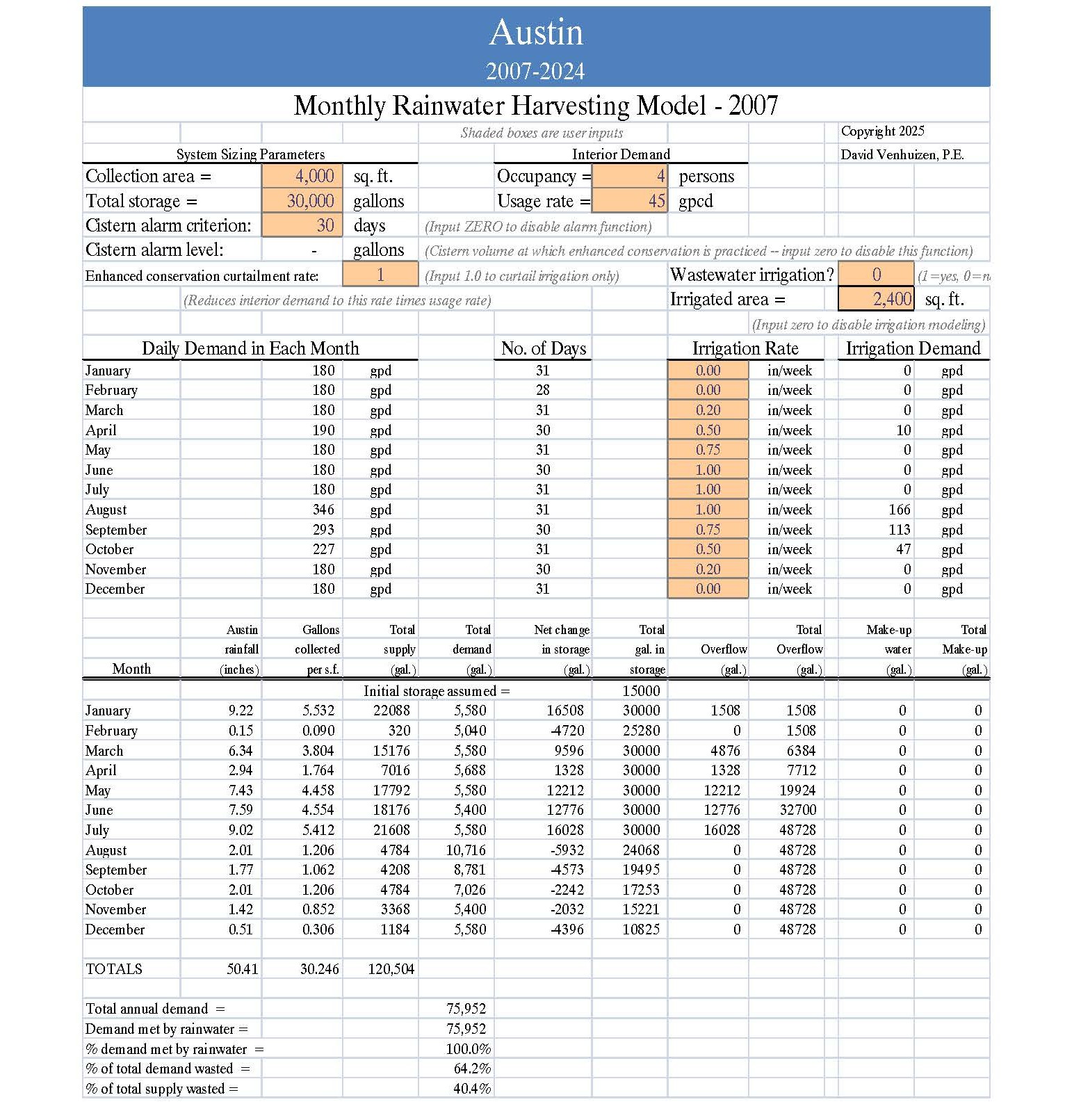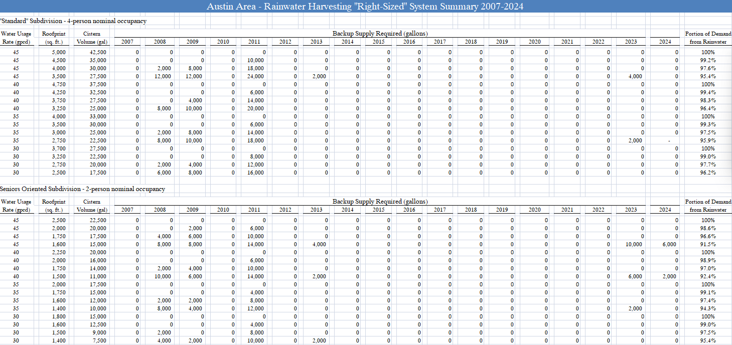 A historical rainfall model is used to determine what would be a “right-sized” system. Here a model using rainfall data for the Austin area covering the years 2007 to 2024 is used to illustrate that. This covers the 2008-2014 drought period, now recognized as the new drought of record for the Highland Lakes, and the more recent somewhat dry years, so this period presents a fairly severe scenario for the sustainability of building-scale rainwater harvesting.