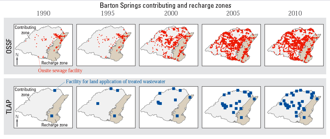 The graphic above shows the growth of those wastewater sources from 1990 to 2010. The top line of graphics shows the growth in number of OSSFs. That stands for on-site sewage facility, the Texas rules-speak name for what are popularly known as “septic” systems. The bottom line shows TLAP systems. That stands for Texas land application permit. In this type of wastewater system, the effluent is spewed out over an area that is “irrigated” mainly just to make the water go “away” rather than for an actual irrigation benefit, such as an improved landscape or growing a marketable crop. In the most used type of “septic” system – consisting of an “aerobic treatment unit” (ATU) and a couple of spray rotors – the wastewater is also spewed out over the ground, with little regard for the value of the water, or of the environmental impacts. Such as increasing the nitrate levels in Barton Springs.