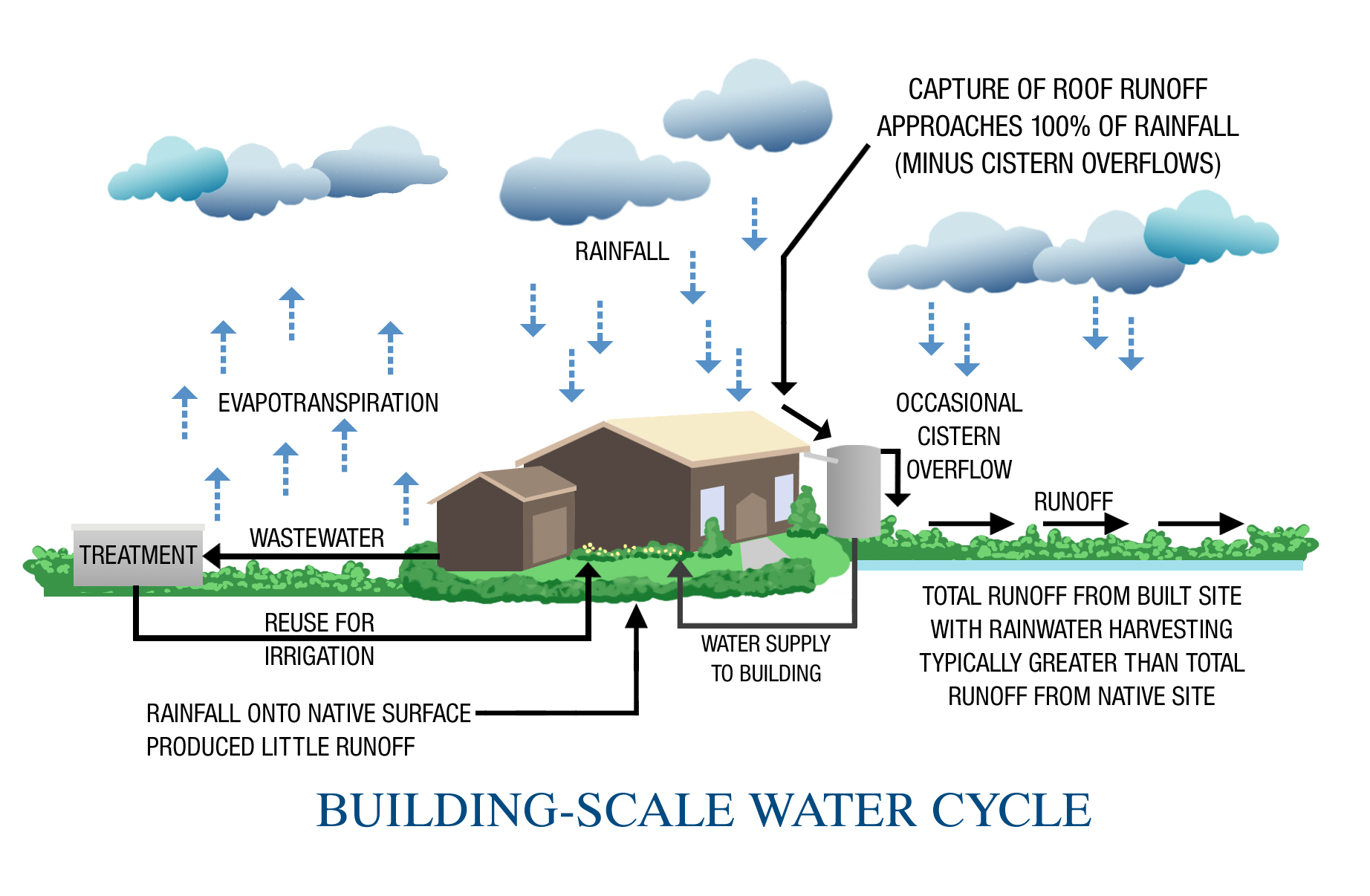 There is a caveat on the “zero” in Zero Net Water. The cistern in a building-scale rainwater harvesting system operates in the same manner as a reservoir in a conventional surface water supply system – it stores the water for future use. Just like a reservoir, a building-scale cistern has a “firm yield” that will cover a given water demand profile. The building-scale cistern is typically sized to cover most conditions, with imported backup supply added to get through the worst drought periods. Considerations of cost efficiency and the sustainability of the backup supply system lead to the concept of “right-sizing” of the building-scale rainwater harvesting system. This is the combination of roofprint and cistern volume relative to the expected water usage profile that would result in only limited backup supply requirements, needed only during the worst drought periods.