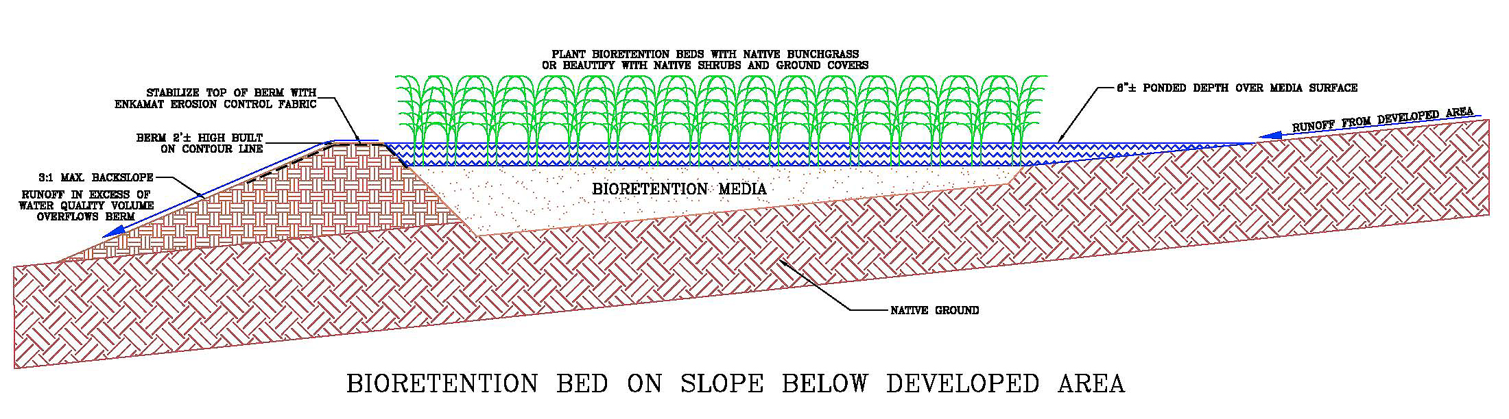 A bioretention bed stores the WQV until it can be infiltrated into the soil below it. A combination of the void volume in the bioretention media and a ponded depth above the media provides this storage. The minimum required footprint of the bioretention bed is determined by the infiltration rate of the soil underlying the bed. The height of the berm would be set so that the bioretention bed surface would run far enough up the slope to provide the required area. Any runoff into the bioretention bed in excess of the WQV would overflow the berm, either as sheet flow or through defined overflow weirs, in which case provisions would have to be made to avoid erosion due to those channelized flows.