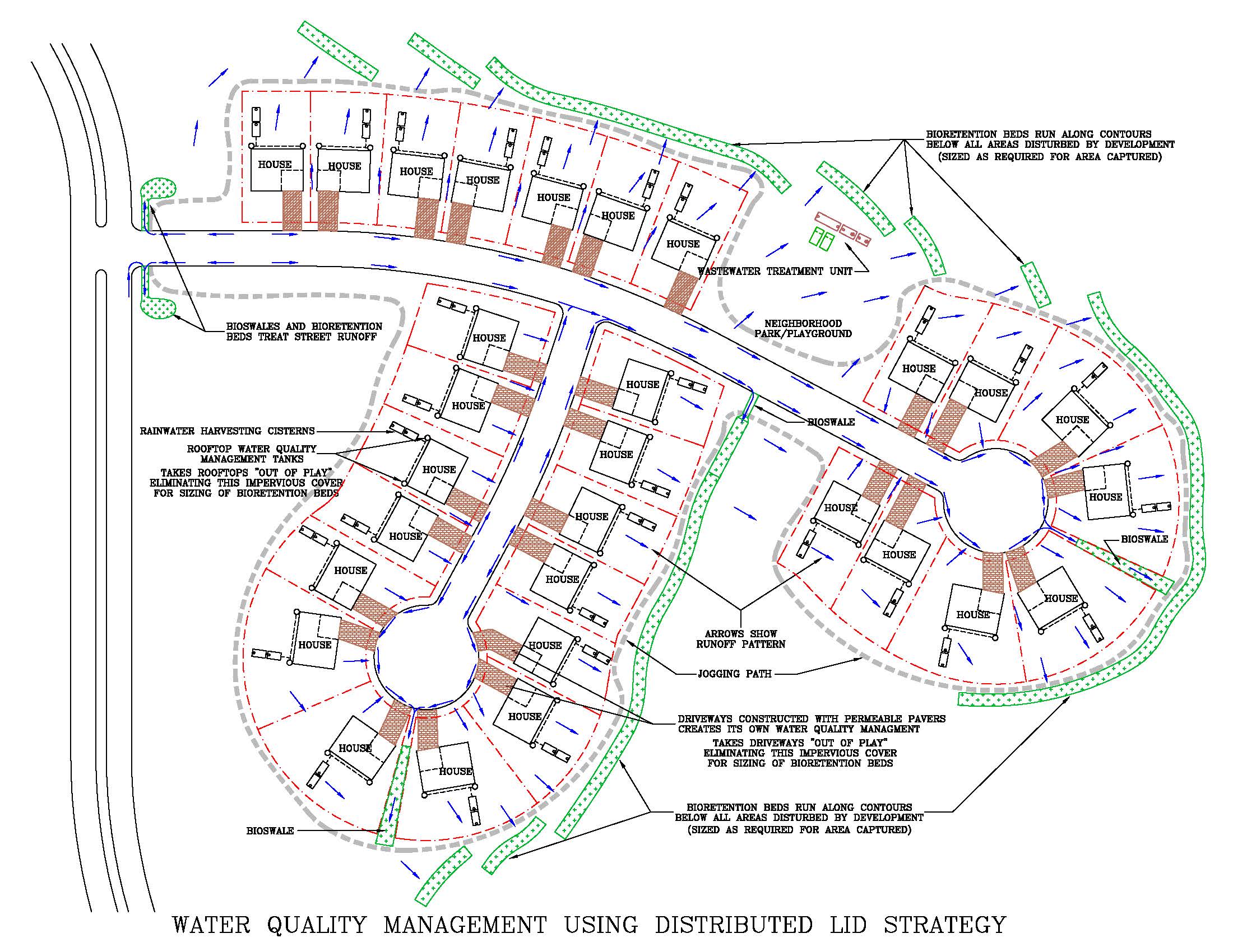 As for the cost efficiency of this strategy, notice in the overall neighborhood plan there are no storm sewers. Indeed, flows would only be channelized in the street gutters, flows which are directed into bioretention beds where they are spread out and infiltrated. It has been typically observed that this sort of stormwater management concept, centered on distributed green infrastructure rather than gathering runoff into more centralized end-of-pipe devices, is significantly less expensive, even as it does a better job of water quality management. Add on the water supply value the suggested scheme provides and this approach is no doubt significantly more cost efficient, both directly for the developer and globally for society.