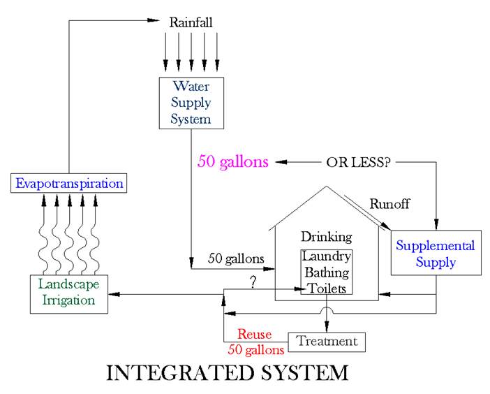 Under the Zero Net Water concept, wastewater reuse would be maximized to supply non-potable water demand. Particularly for irrigation in this climate. Indeed, wastewater reuse is highly valuable to rainwater harvesters, if they want to maintain an irrigated landscape. That’s because, as we’ve seen, a “right-sized” system just for interior use is already “large”. So to also supply irrigation directly out of the cistern, the system would have to be made even larger in order to maintain sustainability of the water supply system, and that would be costly, of course. Or the users would have to bring in a MUCH larger backup supply. But neither is needed, as there is already a flow of water sitting right there that could be used for irrigation instead of drawing that water directly from the cistern. A supply for which a hefty price has already been paid to gather. That’s the wastewater flowing from the house. Don’t lose it, reuse it!