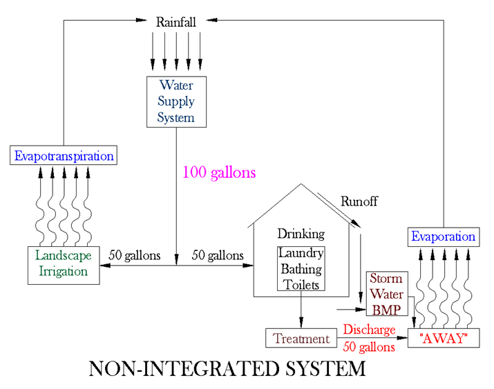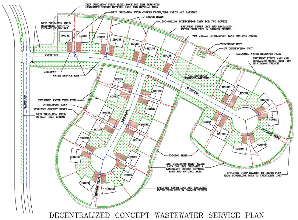 Still a variant of Zero Net Water that might be called “Minimum Net Water” can deliver some of the benefits. If the development will get water service from a watershed-scale system, it can still be arranged to pretty much take irrigation off that potable supply, by rainwater harvesting and/or wastewater reuse. In this region, that would typically lop off about 40% of total annual demand. And of course it would be an even higher percentage of peak period demand, and it is peak demand that drives a lot of water system investment, so that is very valuable.