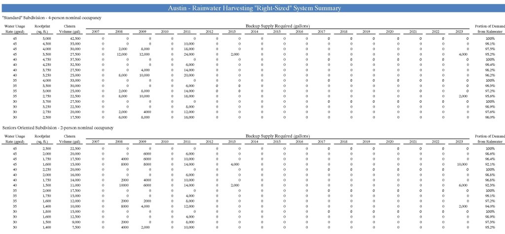 On that basis this table shows that for a “standard” subdivision, at a water usage rate of 45 gallons/person/day, a “right-sized” system would need to have a roofprint of 4,000 sq. ft. and a cistern volume of 30,000 gallons, as this would provide 97.6% coverage of total water demand through the modeling period. This compares with a 5,000 sq. ft. roofprint and a 42,500-gallon cistern that would have been required to have provided 100% coverage. Following the “right-sizing” strategy, the savings on each house would be 1,000 sq. ft. of roofprint and 12,500 gallons of cistern volume. This would be a rather large savings in costs to build the RWH systems, purchased by using backup supply to cover the last 2.4% of demand, needing backup supply only in the rather severe drought years of 2008-2009 and 2011.