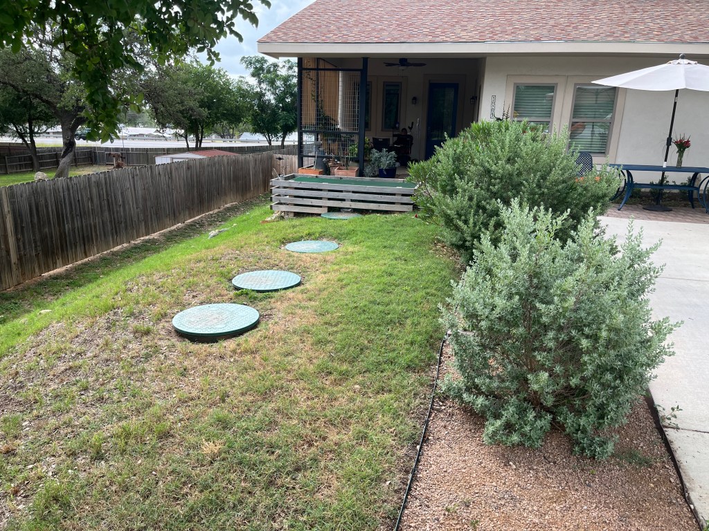 This strategy has been implemented in several jurisdictions in Texas, including Hays County, over the last 3 decades. Examples of drip irrigation fields on some of those lots are shown in Figure 15. On-site reuse, to render the RWH systems more sustainable while maintaining grounds beautification, is readily doable in the Wimberley Valley. Indeed, a larger scale version of this system was implemented at the Blue Hole Elementary School, the so-called “One Water” school.