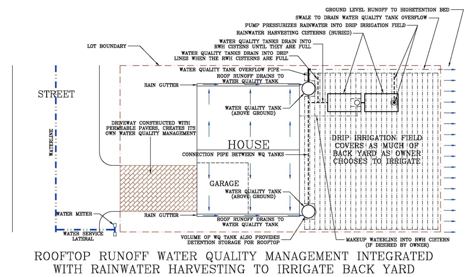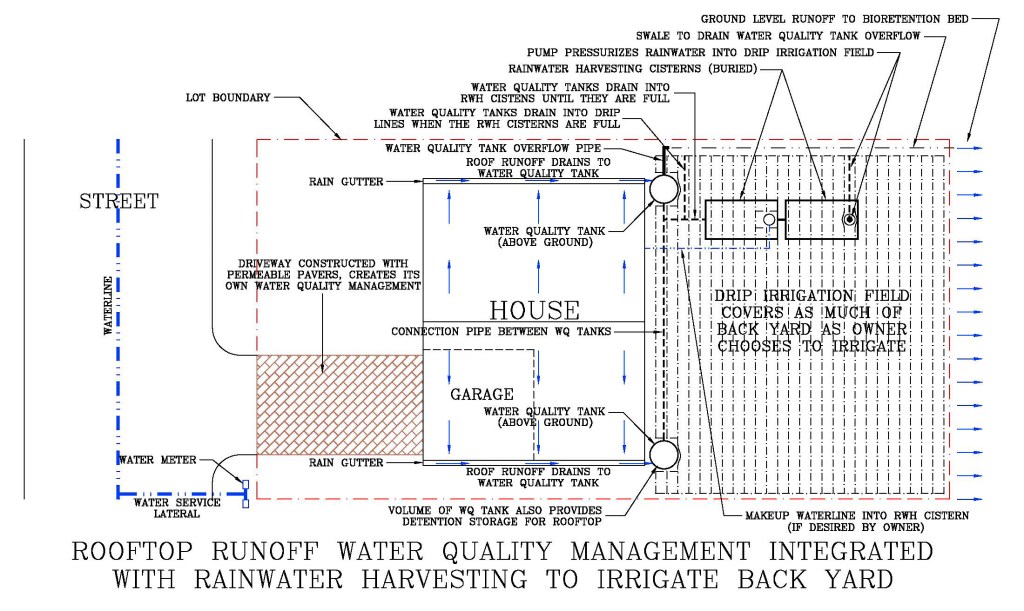 The bottom line is water quality management of this rooftop runoff would be integrated with rainwater harvesting to create an irrigation water supply. Doing this would impart superior water quality management of that runoff, restoring the hydrologic integrity of this patch of ground now covered with the rooftop, and providing irrigation water for the back yard. A lot of benefit obtained by a pretty simple, straightforward system.