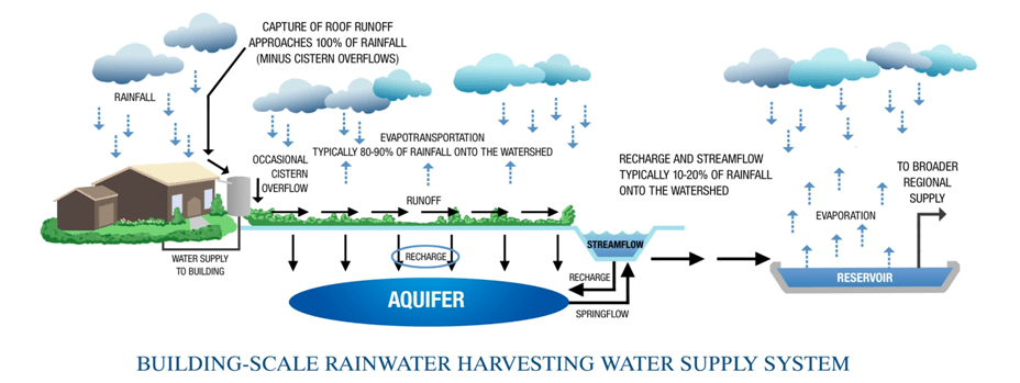 The bottom line is that some of that additional runoff created by development is captured and utilized. That is done instead of allowing the additional runoff to become quickflow, which if not mitigated in some other way creates water quality, channel erosion and flooding problems. Thus, with building-scale rainwater harvesting, overall yield of water supply usable by humans can be fundamentally improved, increasing the usable water yield without any significant impact on streamflow.
