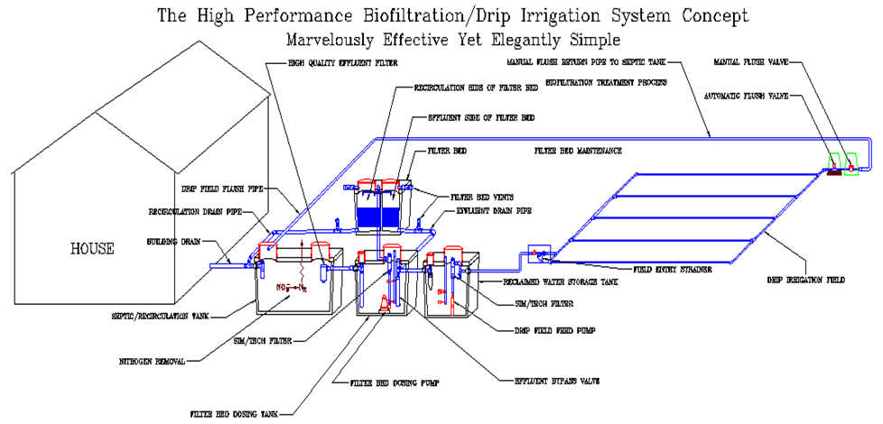 The reuse can be done house by house if the development features larger lots, with wastewater service provided by on-site wastewater systems, commonly called “septic” systems. Those on-site systems can employ the highly stable and reliable High Performance Biofiltration Concept system mated with a subsurface drip irrigation dispersal system. This concept is illustrated in Figure 14.