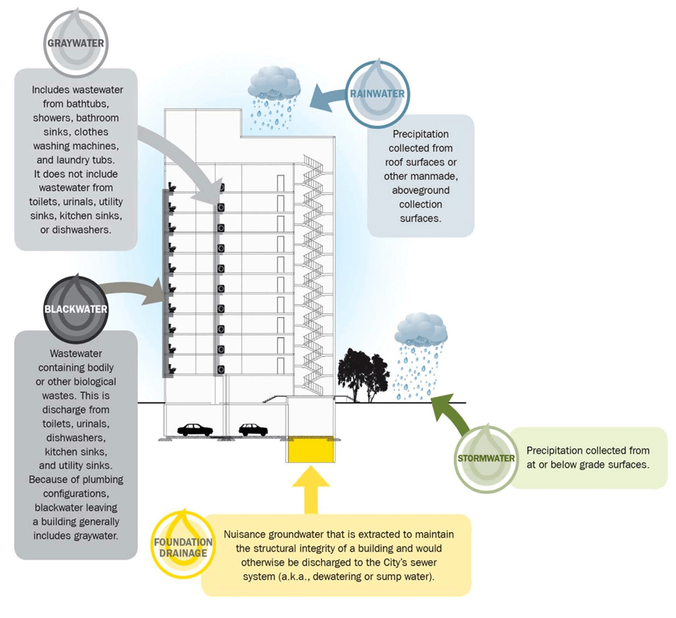 Along with RWH providing the original water supply, project-scale wastewater reuse could be employed for irrigation, and also for toilet flush supply, and the LID/green infrastructure stormwater management scheme could harvest runoff from paved areas of the site too, and feed it into landscape elements – rain gardens – that, again, don’t need routine irrigation. An illustration of applying these strategies to a commercial building is shown in Figure 18.