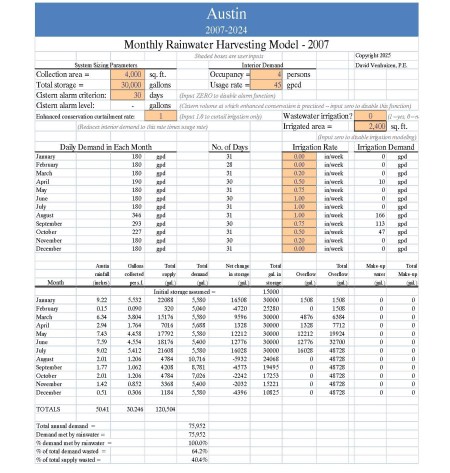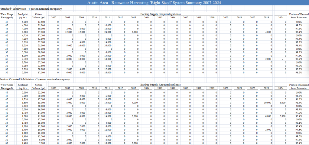 A historical rainfall model is used to determine what would be a “right-sized” system. Here a model using rainfall data for the Austin area covering the years 2007 to 2024 is used to illustrate that. This covers the 2008-2014 drought period, now recognized as the new drought of record for the Highland Lakes, and the more recent somewhat dry years, so this period presents a fairly severe scenario for the sustainability of building-scale rainwater harvesting.