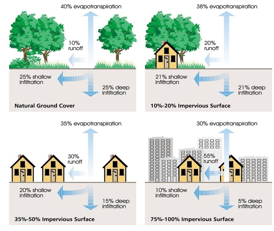 The Zero Net Water strategy would be used to serve new development, and when raw land is developed, as illustrated in Figure 3 quickflow runoff increases at the expense of decreased infiltration. When the land is transformed from a natural site to just 10-20% impervious cover, like in an exurban subdivision, the runoff would double, and with housing at more like urban intensity, typically imparting 35-50% impervious cover, it would triple. To prevent flooding, water quality, and channel erosion problems, measures must be taken to mitigate that shift from infiltration to runoff.
