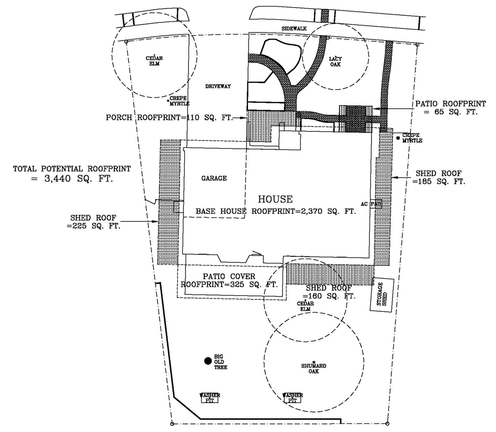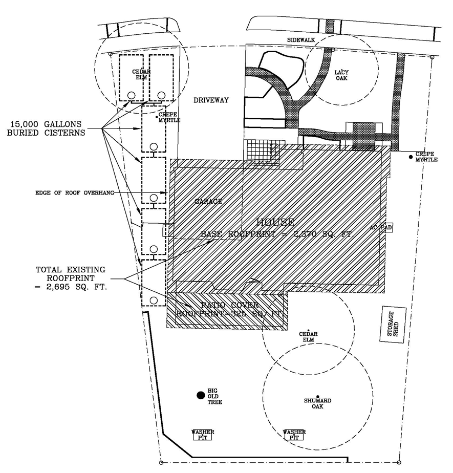 With the roofprint areas needed to “right-size” RWH systems in the Wimberley Valley, it may be questioned if this strategy is indeed only applicable in developments with “large” lots. The example of an urban lot in a South Austin neighborhood offers a look at that. Illustrated in Figure 11, this is a 1/5-acre lot with a 1,580 sq. ft., 3-bedroom, 2-bath house, and a garage, fairly typical in that neighborhood.