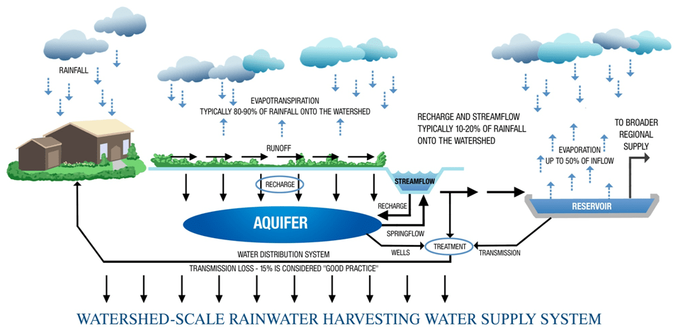 A really big inefficiency, as can be seen in the illustration in Figure 1, is that only a minor fraction of rainfall over a watershed, something like 15%, makes it into streams, reservoirs or aquifers, the “cisterns” of the watershed-scale system. Most of it is lost to evapotranspiration, which of course supports plant life in the watershed.