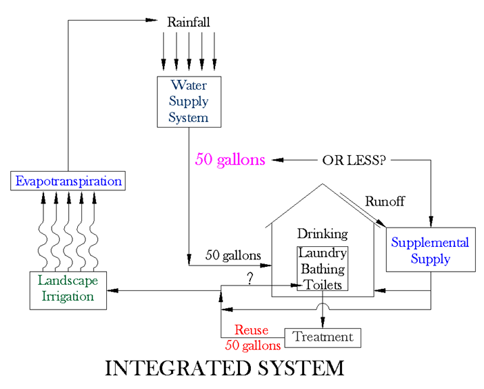 Under the Zero Net Water concept, wastewater reuse would be maximized to supply non-potable water demand. Particularly for irrigation in this climate. Indeed, wastewater reuse is highly valuable to rainwater harvesters, if they want to maintain an irrigated landscape. That’s because, as we’ve seen, a “right-sized” system just for interior use is already “large”. So to also supply irrigation directly out of the cistern, the system would have to be made even larger in order to maintain sustainability of the water supply system, and that would be costly, of course. Or the users would have to bring in a MUCH larger backup supply. But neither is needed, as there is already a flow of water sitting right there that could be used for irrigation instead of drawing that water directly from the cistern. A supply for which a hefty price has already been paid to gather. That’s the wastewater flowing from the house. Don’t lose it, reuse it!