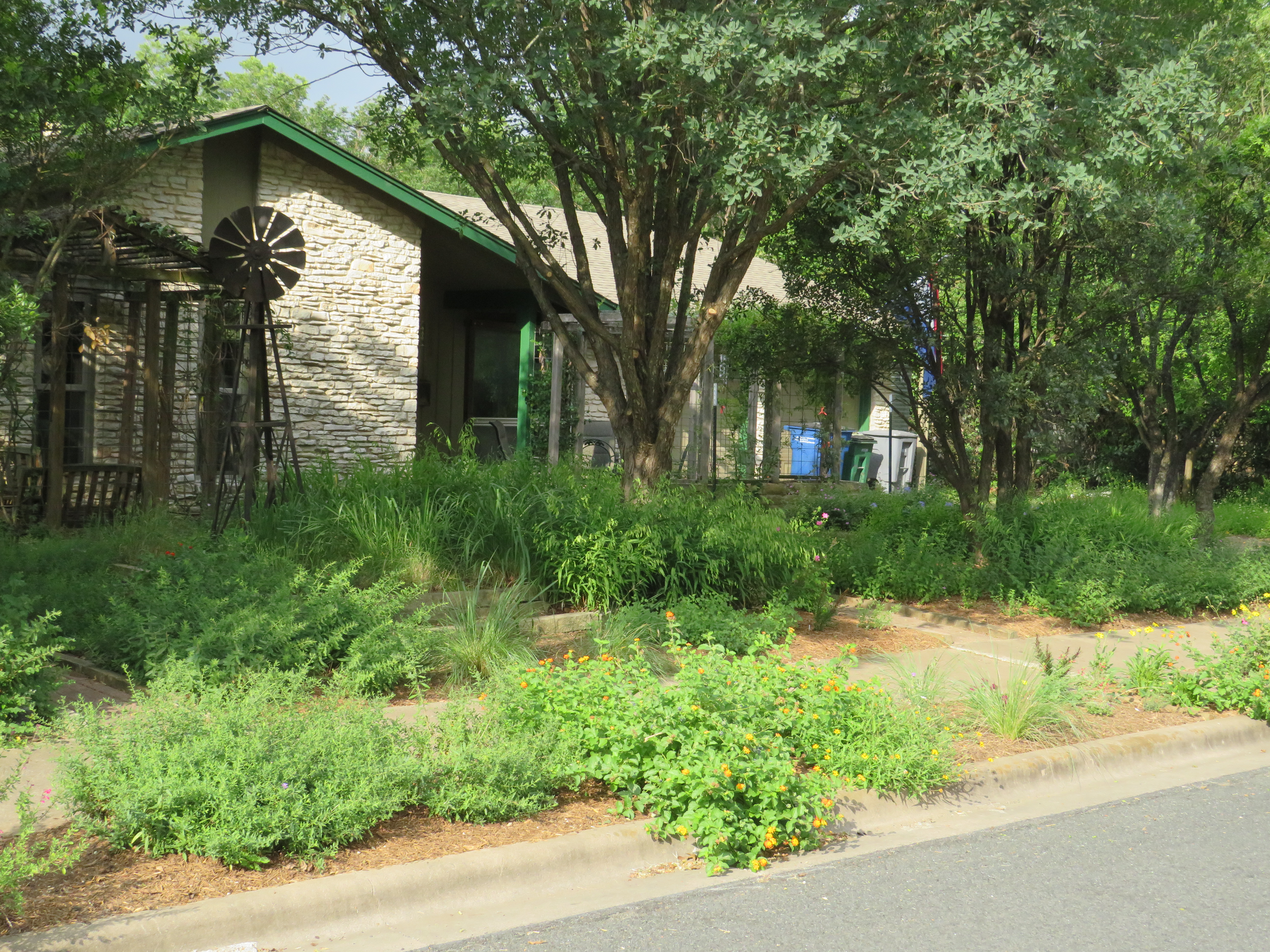 An even better strategy is to scale these bioretention beds down and spread them around. At this scale, as shown in Figure 5, these installations are usually called by their more colloquial name, “rain gardens”. With this strategy, the rainfall is captured and infiltrated in a manner that more closely mimics how that is done on the native site, on a highly distributed basis. Using many distributed rain gardens instead of one end-of-pipe pond somewhat restores the “hydrologic roughness” which is characteristic of raw land, so holding water on the land. This maximizes hydrologic integrity, achieving that aspect of Zero Net Water. And again, creates interesting landscape elements that don’t need routine irrigation.