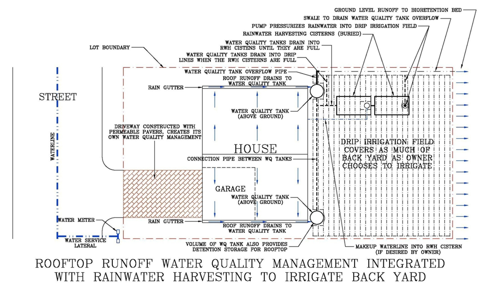 The bottom line is water quality management of this rooftop runoff would be integrated with rainwater harvesting to create an irrigation water supply. Doing this would impart superior water quality management of that runoff, restoring the hydrologic integrity of this patch of ground now covered with the rooftop, and providing irrigation water for the back yard. A lot of benefit obtained by a pretty simple, straightforward system.