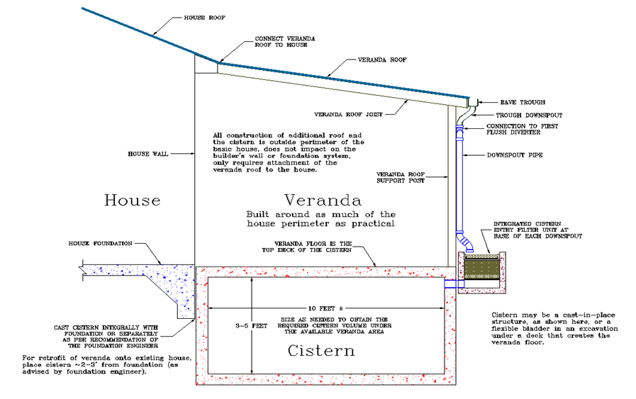 Another advantage to this “veranda strategy” is that the cistern could be integrated into the house design. With a large area of veranda, the cistern need not be very deep under the veranada floor to attain the storage needed. An illustration of building the storage in under the veranda floor is shown in Figure 10.