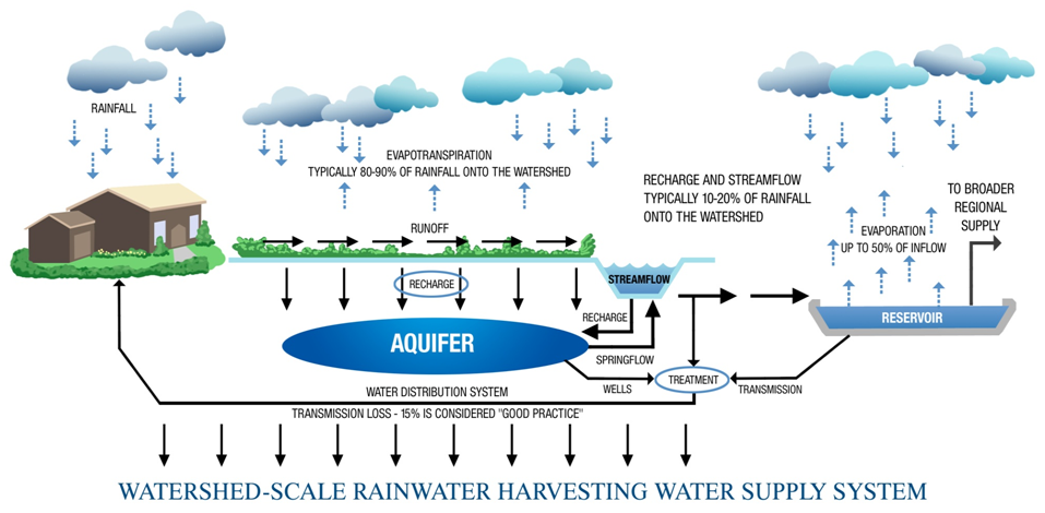 This integrated management results in minimal disruption of flows through the watershed, even as water is harvested at the site scale to be used – and reused – there to support development, creating a sustainable water development model. This integrated model would better utilize the water supply that routinely falls upon the Wimberley Valley, so rendering the whole system more efficient. This all is of course the essence of the “One Water” idea.